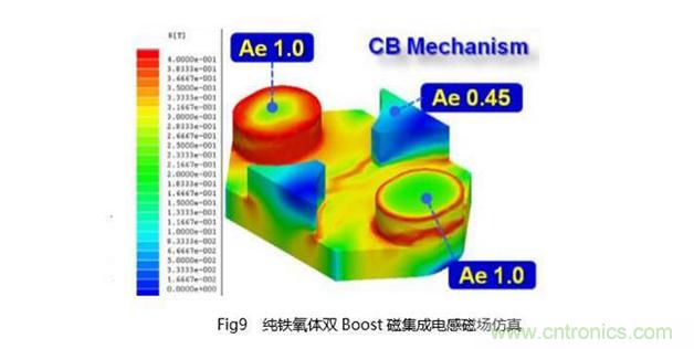 對于這種新型高效電感的設計,和Boost電感設計要求一樣,要求該電感在大紋波電流工作時,保持極佳的效率。由于其電感量可以設計成比較小的感值,即使要求直流內(nèi)阻較低,用銅量也能得到大幅的控制。對于磁性材料中的ΔB磁場變化率大的問題,同樣地采用Hybrid Magnetics技術,可以控制磁性的損耗、減少漏磁的存在,達到很少的用銅量也能保持很低的內(nèi)阻的目的。