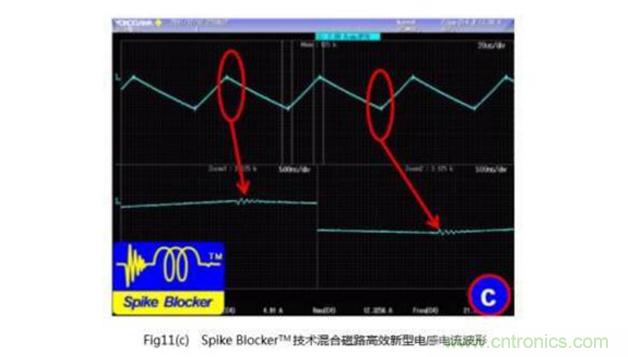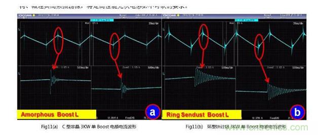 圖11(a)為目前廣為采用的C型非晶材料繞制的3 kW單Boost電感的額定功率時的典型工作電流波形。在Boost開通和關斷時,電感電流出現(xiàn)了比較嚴重的高頻振蕩,其振蕩頻率成分也比較豐富,約在20~30 MHz寬帶上;Fig11(b)為采用數(shù)只φ47的鐵硅鋁磁環(huán)繞制的3 kW單Boost電感的波形,同樣圖中顯示出10 MHz左右的高頻衰減振蕩;Fig11(C)則為采用了優(yōu)化結(jié)構和相關設計工藝規(guī)范的Spike Blocker TM技術后,使用Hybrid Magnetics混合磁路設計的新型高效能電感的實測波形(這些測試均基于相同設備、相同輸入輸出電壓、功率、工作頻率條件),由此可見,關注電感的EMC設計工藝規(guī)范具有十分重要的意義。