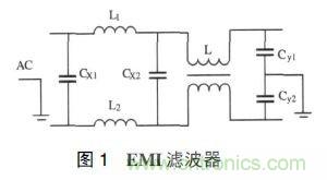 濾波是一種抑制傳導(dǎo)干擾的方法, 在電源輸入端接上濾波器可以抑制來自電網(wǎng)的噪聲對電源本身的侵害, 也可以抑制由開關(guān)電源產(chǎn)生并向電網(wǎng)反饋的干擾。電源濾波器作為抑制電源線傳導(dǎo)干擾的重要單元, 在設(shè)備或系統(tǒng)的電磁兼容設(shè)計中具有極其重要的作用。電源進(jìn)線端通常采用如圖1 所示的EMI 濾波器電路。該電路可以有效地抑制交流電源輸入端的低頻差模騷擾和高頻段共模騷擾。在電路中, 跨接在電源兩端的差模電容Cx1、Cx2 ( 亦稱X 電容) 用于濾除差模干擾信號, 一般采用陶瓷電容器或聚脂薄膜電容器, 電容值通常取0.1~ 0. 47F。而中間連線接地的共模電容Cy1和Cy2 ( 亦稱Y 電容) 則用來短路共模噪聲電流, 取值范圍通常為C1=C2 # 2 200 pF。抑制電感L1、L2 通常取100~ 130H, 共模扼流圈L 是由兩股等同并且按同方向繞制在一個磁芯上的線圈組成, 通常要求其電感量L#15~ 25 mH。當(dāng)負(fù)載電流渡過共模扼流圈時, 串聯(lián)在火線上的線圈所產(chǎn)生的磁力線和串聯(lián)在零線上線圈所產(chǎn)生的磁力線方向相反, 它們在磁芯中相互抵消。因此, 即使在大負(fù)載電流的情況下, 磁芯也不會飽和。而對于共模干擾電流, 兩個線圈產(chǎn)生的磁場是同方向的, 會呈現(xiàn)較大電感, 從而起到衰減共模干擾信號的作用。