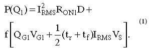 在等式1中,第一項(xiàng)反映了傳導(dǎo)損耗,第二項(xiàng)反映了動態(tài)和柵極損耗。I RMS是漏極電流; R ON是溝道電阻; D是占空比; f是開關(guān)頻率; t r和t f分別是切換上升和下降時(shí)間; 和V S是輸入源電壓。