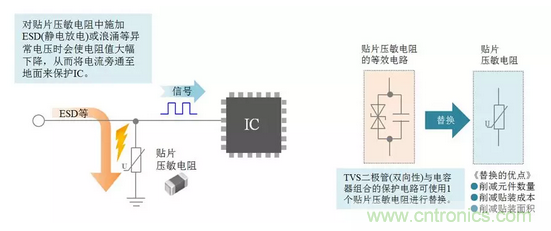 同時,在移動設(shè)備中,開關(guān)及麥克風的小孔會成為人體產(chǎn)生的ESD的入口,因此需要采取ESD對策。貼片壓敏電阻可保護電路免受ESD(靜電放電)及浪涌等的影響,同時在通常情況下發(fā)揮著電容器的功能,因此還擁有抑制噪音的效果(圖3)。