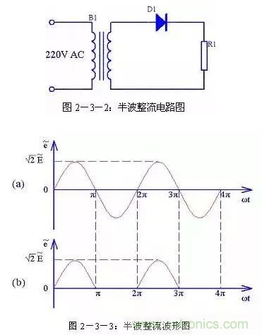 半波整流電路見(jiàn)圖2-3-2。其中B1是電源變壓器,D1是整流二極管,R1是負(fù)載。B1次級(jí)是一個(gè)方向和大小隨時(shí)間變化的正弦波電壓,波形如圖 2-3-3(a)所示。0~π期間是這個(gè)電壓的正半周,這時(shí)B1次級(jí)上端為正下端為負(fù),二極管D1正向?qū)?,電源電壓加到?fù)載R1上,負(fù)載R1中有電流通過(guò);π~2π期間是這個(gè)電壓的負(fù)半周,這時(shí)B1次級(jí)上端為負(fù)下端為正,二極管D1反向截止,沒(méi)有電壓加到負(fù)載R1上,負(fù)載R1中沒(méi)有電流通過(guò)。在 2π~3π、3π~4π等后續(xù)周期中重復(fù)上述過(guò)程,這樣電源負(fù)半周的波形被“削”掉,得到一個(gè)單一方向的電壓,波形如圖2-3-3(b)所示。由于這樣得到的電壓波形大小還是隨時(shí)間變化,我們稱(chēng)其為脈動(dòng)直流。
