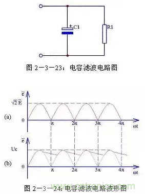 電容濾波電路圖見(jiàn)圖2-3-23,電容濾波電路是利用電容的充放電原理達(dá)到濾波的作用。在脈動(dòng)直流波形的上升段,電容C1充電,由于充電時(shí)間常數(shù)很小,所以充電速度很快;在脈動(dòng)直流波形的下降段,電容C1放電,由于放電時(shí)間常數(shù)很大,所以放電速度很慢。在C1還沒(méi)有完全放電時(shí)再次開(kāi)始進(jìn)行充電。這樣通過(guò)電容C1的反復(fù)充放電實(shí)現(xiàn)了濾波作用。濾波電容C1兩端的電壓波形見(jiàn)圖2-3-24(b)。