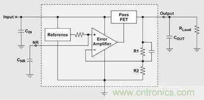 圖1:LDO中的傳輸元件為P型MOSFET,其可以在接近飽和狀態(tài)下工作。這與傳統(tǒng)線性穩(wěn)壓器相比,是通過(guò)降低VDROPOUT來(lái)提高效率。(圖片來(lái)源:Texas Instruments)