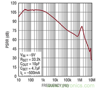 圖2:該圖顯示高性能LDO的PSRR頻率響應(yīng):在1kHz時(shí),良好LDO的基準(zhǔn)值介于60dB至110dB之間。(圖片來(lái)源:Analog Devices)