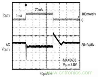 圖3:對(duì)輸出負(fù)載快速變化的瞬態(tài)電壓響應(yīng)是無(wú)線傳感器應(yīng)用的LDO關(guān)鍵性能指標(biāo)。此處所示為高性能LDO的響應(yīng)。(圖片來(lái)源:Maxim Integrated)