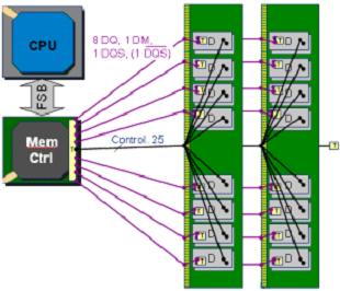 DDR2在DDR的基礎上將芯片接口時鐘頻率提高一倍并將工作電壓從2.5V降低至1.8V,從而使其能在相對更低的功耗下獲得更高的傳輸速率。一般情況下,DDR2的輸入時鐘頻率覆蓋200/266/333/400/533MHz,傳輸比特率覆蓋400/533/667/800/1066Mb/s/pin。相對于DDR,由于速度的提升,DDR2在主板設計要求上也有所變化。內(nèi)存控制器每Channel可級聯(lián)的DIMM數(shù)從DDR時期的4到8條減少至2到3條,數(shù)據(jù)線(DQ)上的終端電阻從主板上的分立電阻搬移到了DRAM芯片內(nèi)部(ODT),數(shù)據(jù)同步信號(DQS)由單端信號變?yōu)閱味嘶虿罘挚蛇x信號。DDR2主板系統(tǒng)架構如右圖所示。