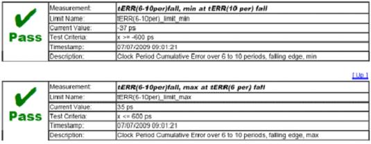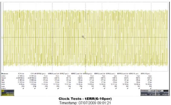 JEDEC標準要求測量n分別為2、3、4、5、6-10、11-15時tERR(n per)的最大及最小值。對于這樣的要求,如果要用手工測量將是非常耗時且低效率的。力科QPHY-DDR2軟件包的時鐘測量部分支持上述所有參數(shù)的自動測量,僅需使用一根差分探頭將時鐘信號接入示波器即可完成所有的測量工作,測量后的所有參數(shù)結果及對應波形將列在自動生成的測試報告中并與JEDEC標準中門限值進行比較。如下圖為使用QPHY-DDR2測量tERR(6-10 per)時的部分結果與對應波形。