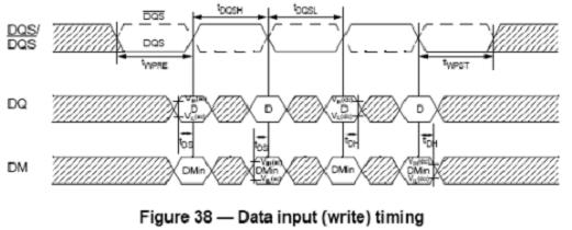下圖為JEDEC標準中所繪制的一個簡單的寫操作波形。對比上圖的讀操作波形,我們可以看出兩者時序上的區(qū)別主要在于,DDR2寫操作時DQ或DM的數(shù)據(jù)中心與DQS信號邊沿對齊,DQS前導信號的低脈沖長度明顯減小,大約為半個時鐘周期或以下。