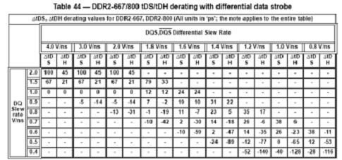 時序測試部分主要對DDR2數(shù)據(jù)、時鐘及控制線上各種時序進行測量,包括數(shù)據(jù)輸入建立/保持時間、數(shù)據(jù)輸出保持時間、數(shù)據(jù)讀/寫時DQS前導/后續(xù)時間、時鐘半周期寬度、DQS輸入高/低脈沖寬度等等二十余項參數(shù)。其中,在對數(shù)據(jù)輸入建立/保持時間(tDS、tDH)進行測量時,JEDEC標準規(guī)定需要根據(jù)寫數(shù)據(jù)時的DQ及DQS信號斜率對測得的建立保持時間進行修正。下表為JEDEC標準中對應DDR2 667/800的輸入建立/保持時間修正參數(shù)表。例如,寫操作時當DQ測得的斜率為1.5V/ns,DQS斜率為3.0V/ns時,測得的DQ – DQS建立/保持時間需要加上67ps的修正值之后方能與標準中規(guī)定的最小建立/保持時間相比較。