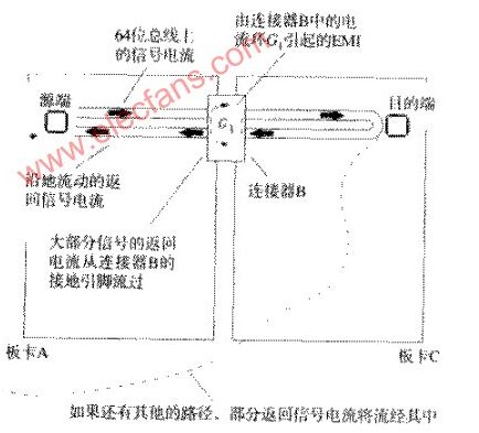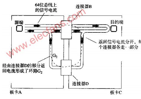 一個64位總線從板卡A經(jīng)過連接器B連到母板卡上,母板卡可能是一個主CPU卡或是一個通往其他子卡的無源通道。64條信號線的返回電流從母板卡C流回板卡A,其中的絕大部分通過了連接器B的接地腳。