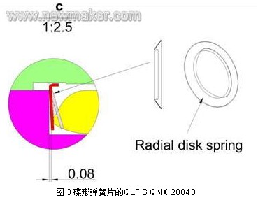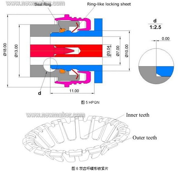 繼 SnapN 之后,07 年Anoison 推出了HPQN 設(shè)計(jì),該設(shè)計(jì)在公頭內(nèi)嵌入一雙齒環(huán)碟形鎖緊片(如圖6),當(dāng)公頭和母頭配合后, 固定在公頭上的雙齒環(huán)碟形鎖緊片緊扣在母頭斜面上,其內(nèi)齒的端面對(duì)母頭產(chǎn)生推力作用,使外導(dǎo)體的端面之間緊密接觸,間隙為0。并且雙齒環(huán)碟形鎖緊片相鄰的內(nèi)齒長度有差異,使鎖緊時(shí)內(nèi)齒停留在母頭斜面的不同圓周上。這種設(shè)計(jì)利用雙齒環(huán)碟形鎖緊片內(nèi)齒的彈力和母頭斜面的支撐力,巧妙地實(shí)現(xiàn)了公頭和母頭端面之間的保持力和接觸壓力,并能達(dá)到非常好的抗震效果。該設(shè)計(jì)的力學(xué)原理很簡單,但是鎖緊片與母頭相對(duì)最佳位置的數(shù)據(jù)需要經(jīng)歷大量的試驗(yàn)。