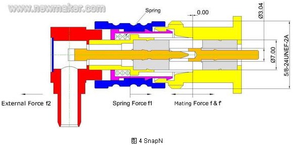 但跟傳統(tǒng)的螺紋連接的N 相比,SnapN 還是有局限性。我們知道 SnapN 外導(dǎo)體端面之間的接觸壓力由其彈簧A 提供--ROSERBERGER 提供的數(shù)據(jù)是30N,根據(jù)力的相互作用原理,我們可以知道接頭的結(jié)合力也是30N。在某些應(yīng)用場合,由于粗重電纜的擺動(dòng),傳導(dǎo)到接頭的作用力很容易超30N,一旦超過這個(gè)臨界力,外導(dǎo)體端面之間會(huì)發(fā)生瞬時(shí)分離,而影響信號(hào)傳輸。那是否能提高這個(gè)臨界力呢?我們知道,彈簧A 對(duì)外導(dǎo)體端面提供的接觸壓力與接頭的結(jié)合力是等量的,如果我們增加彈簧作用力---比如增加到100N,那意味著接頭結(jié)合力也達(dá)到100N,顯然,匹配一對(duì)接頭需要用100N 的力氣是讓人無法接受的。