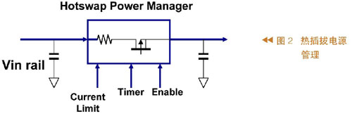 圖1所示為熱插拔過程,其中左邊代表系統(tǒng)及其供電,在供電的輸出端有一個電容,右側有兩張卡,這些卡的輸入端也有電容。把卡插入系統(tǒng)之前,輸入電容沒有被充電;當把卡插入系統(tǒng)時會有一個很大的瞬間電流向輸入電容充電,這么大的瞬時電流很可能造成系統(tǒng)供電電壓不正常。