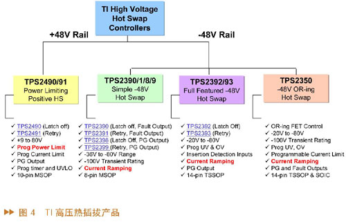 TI推出了很多熱插拔產(chǎn)品,并且多個產(chǎn)品中加入了特殊功能以提升熱插拔的工作功率,這能夠使熱插拔MOS管工作在安全區(qū),從而提高產(chǎn)品可靠度、降低成本。另外一個功能就是di/dt(電流上升的速率),這能夠減少噪音和對電路零件的沖擊。TI的熱插拔產(chǎn)品主要分為兩類:高壓熱插拔產(chǎn)品,針對48V、-48V或24V應用;低壓熱插拔產(chǎn)品,針對3V到15V的應用。