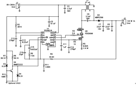 構(gòu)建起如圖3 所示電路,并對其進(jìn)行描述。該電路可在汽車市場獲得應(yīng)用。這里,其擁有一個8V 到36V 的寬范圍輸入,可以為穩(wěn)定12-V 輸出以上或者以下。汽車市場更喜歡使用陶瓷電容器,原因是其寬溫度范圍、長壽命、高紋波電流額定值和高可靠性。結(jié)果,耦合電容器(C6) 便為陶瓷的。這就意味著,相比電解電容器,它擁有較高的AC 電壓,同時這種電路會對低漏電感值更加敏感。