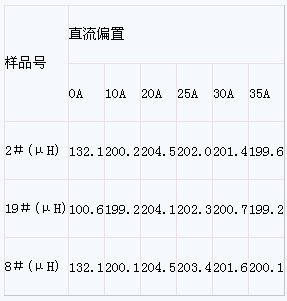 將表1所測(cè)試的電感插入恒磁片后,再加工成成品電感,取三個(gè)成品作測(cè)試樣品,測(cè)試其直流特性如表2所示(測(cè)試儀表為HP4284A,測(cè)試頻率為1kHz):