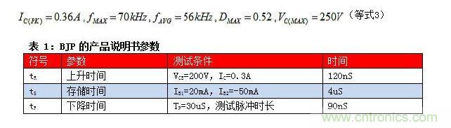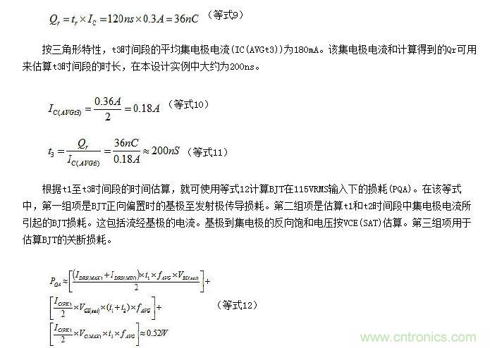 集電極反向恢復電荷(Qr)數(shù)量可用來估算開關損耗時間段t3。根據(jù)BJT產(chǎn)品說明書,參數(shù)Qr的計算結果為36nC。
