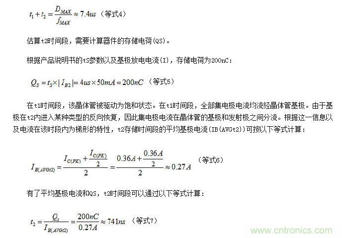 估算晶體管損耗,需要估算圖4中所示的各個時間段。t1時間段是最大占空比的時長,對于本設計示例而言大約是7.4us。