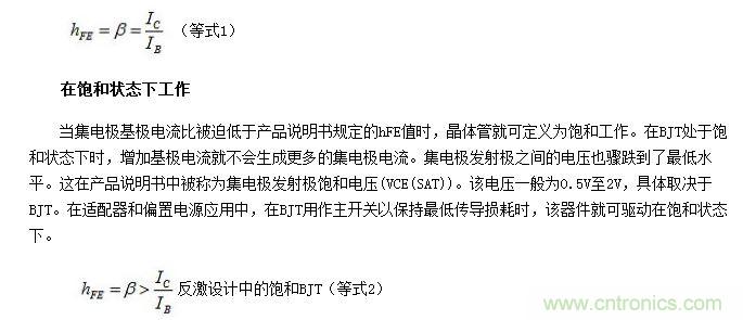 在基極發(fā)射極結點處于正向偏置,而集電極至發(fā)射極路徑為偏置時,這可打開洪流柵極,允許電流流動。連接至集電極的正偏置會吸引自由電子流向集電極端,在N材料中形成電子匱乏。這可吸引來自基極的電子,將其耗盡在N材料中?,F(xiàn)在電流就可流經(jīng)集電極和發(fā)射極的耗盡層,形成完整電路。集電極電流(IC)的數(shù)量可能會比基極電流(IB)多好幾個數(shù)量級。IC與IB之間的比值一般稱為晶體管的DC電流增益。在產(chǎn)品說明書中也可表達為Beta(β)或hFE。注意,在晶體管產(chǎn)品說明書中,該比值在特定條件下給出,可能會有明顯的變化。