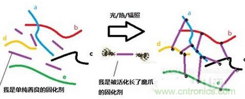 把相對(duì)容易流動(dòng)的液體材料變成固體,這種思路其實(shí)并不新鮮,硫化橡膠就是這種材料加工方式的典型例子。那么,固化的過程是如何發(fā)生的呢?下面,就讓我們來看圖說話: