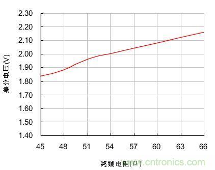 在負(fù)載電阻由45Ω不斷增大到66Ω時(shí),節(jié)點(diǎn)的輸出差分電壓也隨著由1.84V增大到2.16V,兩者近似線性關(guān)系。為了使發(fā)送節(jié)點(diǎn)的輸出差分電壓不至于過低,實(shí)際組網(wǎng)時(shí)負(fù)載電阻應(yīng)在圖 1測試的范圍內(nèi)波動(dòng)。我們分析RL的組成有3個(gè):終端電阻、總線節(jié)點(diǎn)的差分輸入電阻、總線本身的有效電阻。