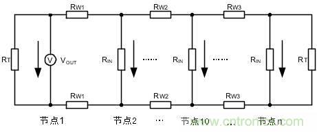 圖 4中,各節(jié)點(diǎn)的RW、RIN難以準(zhǔn)確確定,組網(wǎng)時(shí)以公式計(jì)算較為繁瑣,簡便的方法便是測量總線兩端的節(jié)點(diǎn)電壓。如網(wǎng)絡(luò)的總線電阻過大時(shí),節(jié)點(diǎn)1到節(jié)點(diǎn)n總線對信號的損耗會(huì)很大,當(dāng)節(jié)點(diǎn)n接收的差分電壓低于1.2V時(shí),需要增大終端電阻。