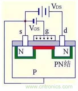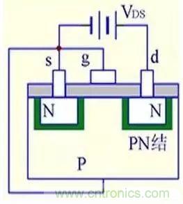 (1) VGS=0時(shí),不管VDS極性如何,其中總有一個(gè)PN結(jié)反偏,所以不存在導(dǎo)電溝道。