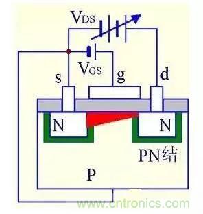 (4) VGS>0且VDS增大到一定值后,靠近漏極的溝道被夾斷,形成夾斷區(qū)。