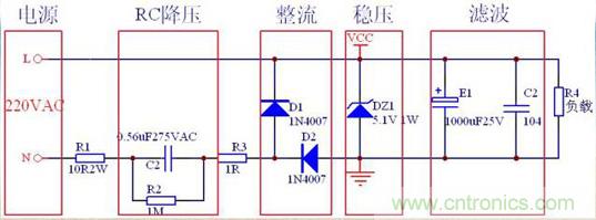阻容降壓是一種利用電容在一定頻率的交流信號下產(chǎn)生的容抗來限制最大工作電流的電路。
