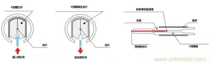 光纖快速連接器/冷接子可分為預(yù)置光纖和非預(yù)置光纖兩大類。預(yù)置光纖快速連接器/冷接子的接續(xù)點(diǎn)在連接器內(nèi)部,并預(yù)置有匹配液;非預(yù)置光纖快速連接器/冷接子的接續(xù)點(diǎn)在連接器表面,不預(yù)置匹配液,直接通過適配器與目標(biāo)光纖對(duì)接。非預(yù)置光纖快速連接器/冷接子的工作原理很簡(jiǎn)單,這里不做贅述。下面詳細(xì)說明預(yù)置光纖快速連接器/冷接子的原理:如下圖所示,預(yù)置光纖膠接在插芯中,接續(xù)點(diǎn)設(shè)在放有折射率近似纖芯的導(dǎo)光材料-匹配液的V型槽中,從而實(shí)現(xiàn)預(yù)置光纖和目標(biāo)光纖的無縫貼合。