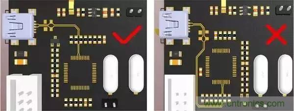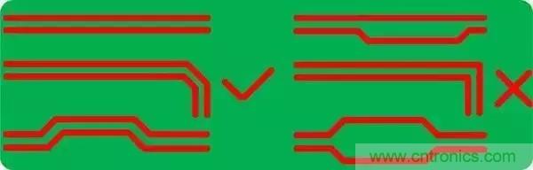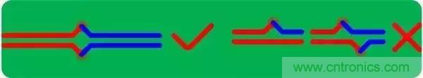 3.對(duì)稱平行走線,這樣能保證兩根線緊耦合,避免90°走線,弧形或45°均是較好的走線方式(√為合理的方式,×為不合理方式);