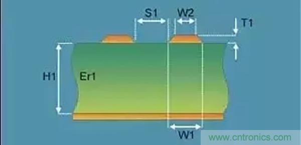 因?yàn)椴罘肿杩褂绊懖罘中盘?hào)的眼圖、信號(hào)帶寬、信號(hào)抖動(dòng)和信號(hào)線上的干擾電壓。差分線阻抗一般控制在90(±10%)歐姆(具體值參照芯片手冊(cè)指導(dǎo)),差分線阻抗與線寬W1、W2、T1成反比,與介電常數(shù)Er1成反比,與線間距S1成正比,與參考層的距離H1正比,如下圖是差分線的截面圖。
