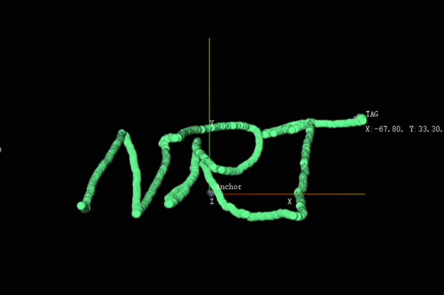單點(diǎn)測(cè)角的誤差方差從1度縮小到0.5度左右,同時(shí)實(shí)現(xiàn)全空間測(cè)角和定位。實(shí)驗(yàn)中可以通過位移精確的寫出文字,如下圖。