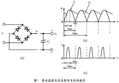 50Hz交流電壓經(jīng)過全波整流后變成脈動直流電壓u1,再通過輸入濾波電容得到直流高壓U1。在理想情況下,整流橋的導通角本應(yīng)為180°(導通范圍是從 0°~180°),但由于濾波電容器C的作用,僅在接近交流峰值電壓處的很短時間內(nèi),才有輸入電流流經(jīng)過整流橋?qū)充電。50Hz交流電的半周期為 10ms,整流橋的導通時間tC≈3ms,其導通角僅為54°(導通范圍是36°~90°)。因此,整流橋?qū)嶋H通過的是窄脈沖電流。橋式整流濾波電路的原 理如圖1(a)所示,整流濾波電壓及整流電流的波形分別如圖l(b)和(c)所示。