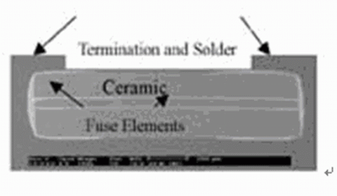 ---AEM SolidMatrix SMD熔斷器與常規(guī)片式熔斷器在結(jié)構(gòu)方面具有顯著的不同:它是疊層多元陶瓷獨(dú)石結(jié)構(gòu)。所謂多元就是指它具有分離的多層熔斷單元。熔斷單元之間用有很好滅弧作用的陶瓷材料隔開。熔斷單元位于陶瓷結(jié)構(gòu)的中部,夾在較厚的陶瓷層中間(見圖1)。其多層熔斷元件結(jié)構(gòu)可以大大增加熔斷元件與滅弧材料的接觸面積,使滅弧反應(yīng)的時(shí)間縮短。