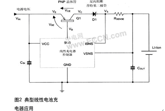 線性充電器設(shè)計簡單,體積較小,并且沒有"開關(guān)模式轉(zhuǎn)換器"常有的噪音,這些優(yōu)點(diǎn)使得線性充電器特別適用于小功率、低噪音應(yīng)用。線性充電器使用外部調(diào)節(jié)元件,以將電池電壓由輸入電源降至電池電壓,因此功率損耗較大。圖2顯示具備外部調(diào)節(jié)元件與反向阻斷肖特基二極管的典型線性充電器應(yīng)用。