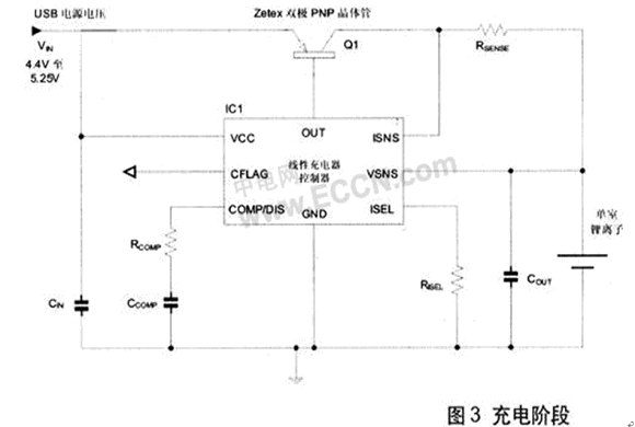 圖3顯示典型USB總線供電單室鋰離子線性電池充電器應(yīng)用,在此應(yīng)用中,Zetex低飽和ZXTP25020CFF雙極PNP晶體管同時具備反向阻斷能力。