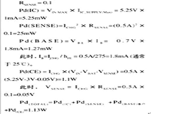 當(dāng)電池處于預(yù)充電壓閾值(VPRE),充電階段進(jìn)入快速充電-恒流階段,此時將產(chǎn)生最大功率損耗。對于正常工作狀態(tài)時出現(xiàn)最高功率損耗的情況,其主要功率損耗區(qū)及計算范例如下所示。此應(yīng)用實(shí)例的電池規(guī)格為:電池:單室鋰離子500mAh如用于便攜式手持設(shè)備(手機(jī)、MP3播放器等)