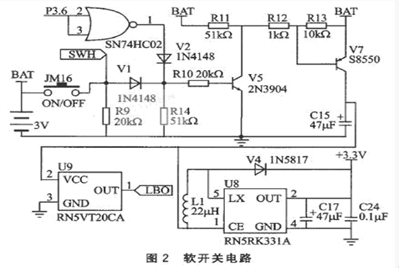 與圖1相比較,用JM16鍵開機后,還必須利用單片機P3.6 輸出低電平實現(xiàn)開機自保,因此稱該電路為“軟開關(guān)電路”。使用該軟開關(guān)電路的優(yōu)點是無須考慮按鍵去抖動問題,硬件電路簡單,可降低硬件成本,節(jié)約印制板板面,在手持式產(chǎn)品中印制板板面是非常寶貴的(元器件的數(shù)量直接影響印制板的大小和產(chǎn)品整體外觀)。缺點是當(dāng)受到外界強信號干擾或由于電池電量不足而引起死機時,按鍵JM16將不起作用,必須取出電池,再重新裝入方能解決死機現(xiàn)象。當(dāng)然這種情況出現(xiàn)的機率極低,且因電池電量不足而引起死機時,就需要更換電池了。而圖1的硬開關(guān)電路中,當(dāng)碰到死機現(xiàn)象時,無需觸摸電池,通過按鍵JM2就能實現(xiàn)開機和關(guān)機。