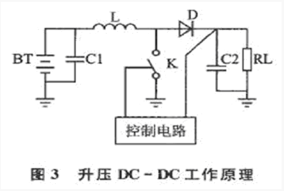 開關(guān)K導(dǎo)通時電池BT給電感L充電,在L中以場的形式儲存能量1/(2L×I2)。 其中,I為電感電流。K斷開后,L中的磁能又以電能的形式釋放給濾波電容C2和負載RL。周期性的開關(guān)操作使電池能量源源不斷地送入負載,而輸出電壓被轉(zhuǎn)換為: