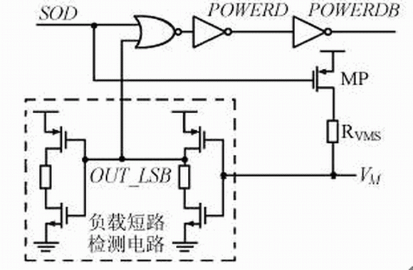 圖4 中SOD為過(guò)放電檢測(cè)信號(hào),系統(tǒng)處于正常狀態(tài)時(shí),SOD為高電平,VM為低電平,因此待機(jī)狀態(tài)控制信號(hào)POWERD輸出高電平、POWERDB輸出低電平。當(dāng)系統(tǒng)進(jìn)入過(guò)放電狀態(tài)時(shí),SOD(延時(shí)后的信號(hào))變?yōu)榈碗娖?,MP導(dǎo)通使VM變?yōu)楦唠娖剑罱K使POWERD變?yōu)榈碗娖?、POWERDB變?yōu)楦唠娖?,它們控制保護(hù)電路相應(yīng)模塊停止工作,系統(tǒng)進(jìn)入待機(jī)狀態(tài)。當(dāng)對(duì)電池進(jìn)行充電時(shí),由圖1可知VM被強(qiáng)制拉到低電平,使負(fù)載短路檢測(cè)電路的輸出信號(hào)OUT_LSB變?yōu)楦唠娖?;此時(shí),不論SOD為何值或非門都將輸出低電平,POWERD由此變?yōu)楦唠娖剑@樣,就可實(shí)現(xiàn)待機(jī)狀態(tài)的退出。