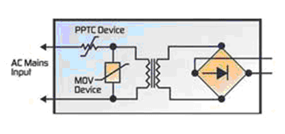 金屬氧化物壓敏變阻器具有高的通流和能量吸收能力,快的響應(yīng)速度,低廉的成本,非常適合在電源端進(jìn)行過壓保護(hù)。PPTC過流保護(hù)器件的額定工作電壓也是交流240V,允許最高達(dá)265V的間歇性電壓,可以與交流電源輸入線路中的壓敏變阻器安裝在一起。