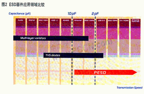 低電容ESD保護(hù)對于高速條件下保持?jǐn)?shù)據(jù)的完整性是非常關(guān)鍵的。在常見的瞬間過電壓抑制器件中,金屬氧化物壓敏電阻(MOV)和多層壓敏電阻(MLV)因價廉物美而應(yīng)用廣泛。但其固有的高電容決定了其應(yīng)用范圍只能局限于低頻領(lǐng)域和電源的瞬間電壓抑制上。而硅類ESD防護(hù)器件,包括齊納二極管、TVS二極管/陣列等,雖然具有保護(hù)電壓低而準(zhǔn)確的優(yōu)點(diǎn),其寄生電容依舊不可忽視,通常難以適用于高速數(shù)據(jù)通訊接口,如HDMI、IEEE1394等。
