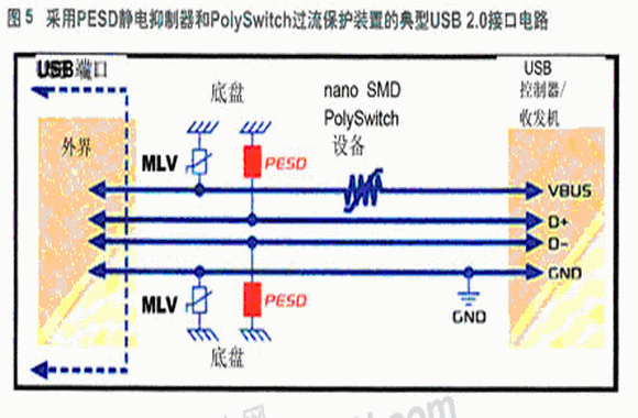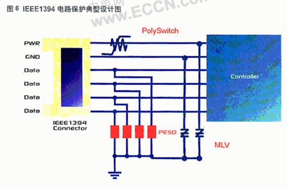 圖4、圖5和圖6展示了利用瑞侃電路保護(hù)部門PESD器件對HDMI1.3、USB2.0和IEEE1394接口電路進(jìn)行保護(hù)的典型應(yīng)用。這些保護(hù)將ESD與敏感電路隔離。在傳輸線路脈沖(TLP) 測試和IEC61000-4-2測試中,尤其是經(jīng)過多次采樣(1000次TLP測試)后,其性能要比其他可比較的元件好。相對于其他典型的聚合物ESD防護(hù)器件,這類PESD器件的較低觸發(fā)電壓(通常150V)和低箝位電壓(通常25V)能更好的幫助保護(hù)敏感電子元件。該器件采用電子工業(yè)中最流行的0603和0402貼裝形式,符合RoHS的嚴(yán)格要求;幫助機(jī)頂盒敏感電路、手提電腦、手機(jī)和其它便攜式設(shè)備免ESD侵害。