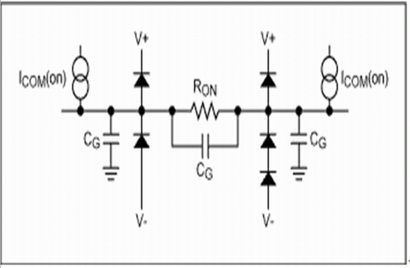 模擬開(kāi)關(guān)內(nèi)的通道元件通常包括一個(gè)或更多的MOSFET,同時(shí)還包含有寄生鉗位二極管(鉗位至電源電壓),用于ESD保護(hù)。圖1顯示了一個(gè)閉合的模擬開(kāi)關(guān)的等效電路圖。只要V+和V-存在,并且輸入電壓不超過(guò):電源電壓 + 鉗位二極管的正向偏壓(典型0.6V),二極管就處于反向偏置,沒(méi)有電流通過(guò)。