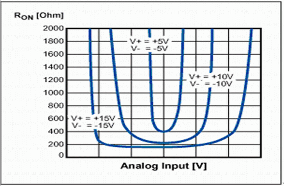 圖4. 早期故障保護(hù)開(kāi)關(guān)的導(dǎo)通電阻隨信號(hào)電壓的變化