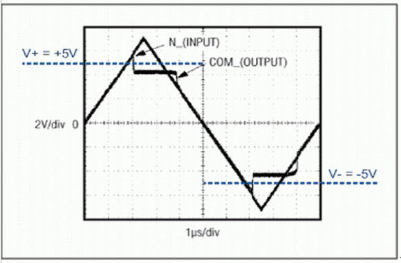 開(kāi)關(guān)內(nèi)部的兩個(gè)比較器用于監(jiān)視輸入電壓,它們將輸入電壓與電源電壓V+和V-進(jìn)行比較。當(dāng)NO (常開(kāi))端或NC (常閉)端上的信號(hào)位于V+和V-之間時(shí),開(kāi)關(guān)正常工作。當(dāng)信號(hào)電壓超出電源約150mV時(shí)(故障情況),輸出電壓(COM)被限制在電源電壓—保持相同極性且輸入為高阻。這是在故障比較器的控制下實(shí)現(xiàn)的,它在故障情況下關(guān)閉了N1和P1。故障比較器同時(shí)還按照以下規(guī)則控制鉗位FET (N2和P2):如果開(kāi)關(guān)閉合時(shí)出現(xiàn)了負(fù)極性故障,接通N2連接COM到V-。如果開(kāi)關(guān)閉合時(shí)出現(xiàn)了正極性故障,則接通P2連接COM到V+。如果開(kāi)關(guān)開(kāi)路時(shí)出現(xiàn)了故障,則輸出呈現(xiàn)高阻。