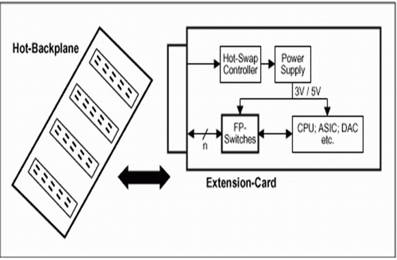 除了一些典型應(yīng)用以外,例如在ATE和工業(yè)設(shè)備中作為模擬輸入的保護(hù),這些低電壓、故障保護(hù)型開(kāi)關(guān)還可以在很多其他應(yīng)用中用來(lái)簡(jiǎn)化設(shè)計(jì)和解決板上空間不足的問(wèn)題。舉例來(lái)講,為了避免切斷整個(gè)設(shè)備機(jī)箱的電源,許多應(yīng)用要求能夠向一個(gè)帶電的底板插入擴(kuò)展卡。盡管可以用MAX4271這樣的熱插拔控制器來(lái)限制卡上的浪涌電流,但其信號(hào)線的保護(hù)并不容易。當(dāng)你將板卡插入底板時(shí),底板的數(shù)據(jù)總線采用5V TTL電平進(jìn)行通信,這時(shí)卡上的數(shù)字IC (微控制器,ASIC等)就有可能在5V電源接通前在其輸入端“看到”5V電壓。前面已經(jīng)提到,這種情況會(huì)導(dǎo)致鎖定或板卡損壞。