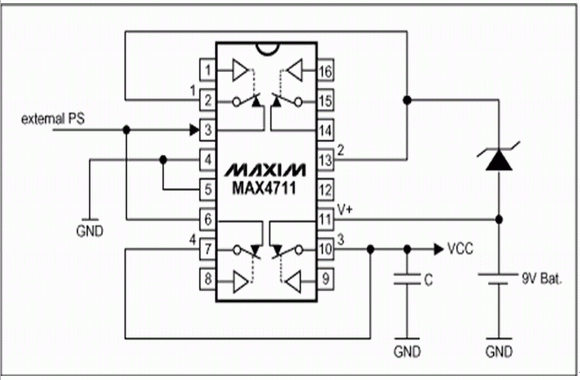 VCC由第10引腳的開(kāi)關(guān)取出,大多數(shù)應(yīng)用中,這個(gè)電壓還要由后面的電壓調(diào)節(jié)器進(jìn)行調(diào)理。一旦檢測(cè)到外部電源電壓,微控制器接通開(kāi)關(guān)1和4,斷開(kāi)開(kāi)關(guān)3。輸出電容C在VCC由開(kāi)關(guān)3切向開(kāi)關(guān)4的過(guò)程中為系統(tǒng)提供電源。為了保護(hù)電池,當(dāng)開(kāi)關(guān)4閉合時(shí),必須始終保持開(kāi)關(guān)3處于斷開(kāi)狀態(tài)。外部電源移走后,開(kāi)關(guān)4和1斷開(kāi)而開(kāi)關(guān)3閉合。當(dāng)外部電源電壓高于電池電壓,或電池已深度放電時(shí)接入外部電源,或C已充電而電池被移走時(shí),故障保護(hù)特性可以保證開(kāi)關(guān)正確、安全地工作。